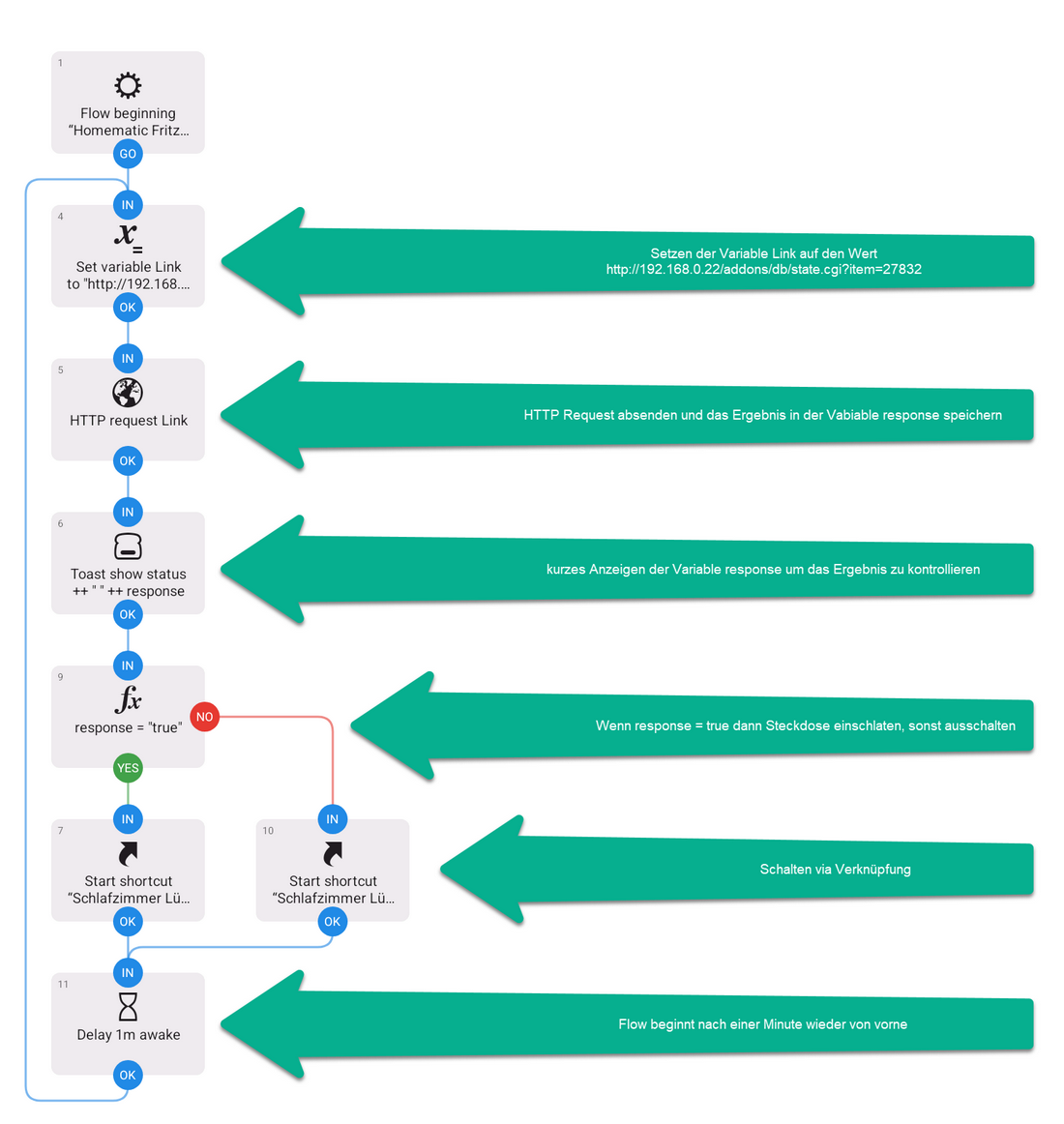 In Automate habe ich einen Flow angelegt der die eigentliche Automatik übernimmt und zyklisch die Systemvariable der Homematic abfragt um die Steckdose ein- oder auszuschalten.