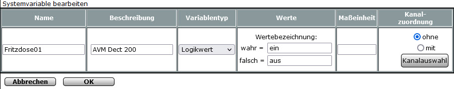 Für jede zu steuernde Steckdose habe ich eine Systemvariable auf der Homematic-CCU3 angelegt: